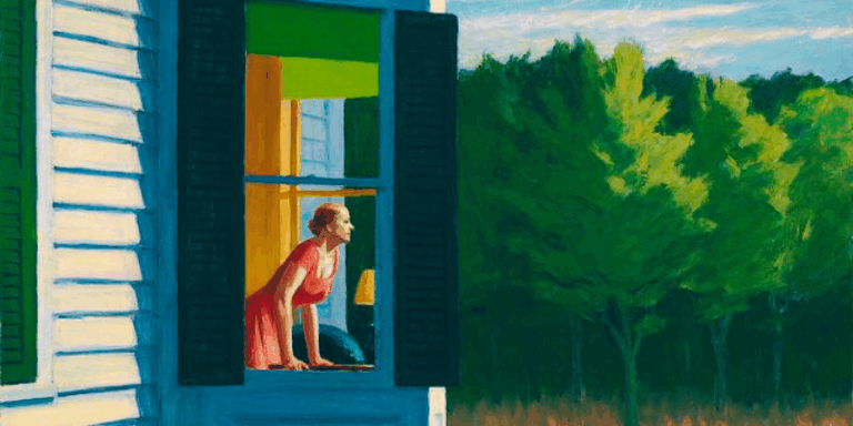 It is summer and the bright white house is sharply shadowed in accordance with the clear morning light and Hopper’s glaring American chiaroscuro, dark lines beneath the lips of the overlapping clapboards. The facet of the jutting window that faces us is shaded while the woman within its little room is well-lit, indicating that the sun is coming up in front of her, which in turn indicates that she is looking to the east, toward the ocean. The golden grass stretching out before her and the house would seem to be a meadow above the sea.