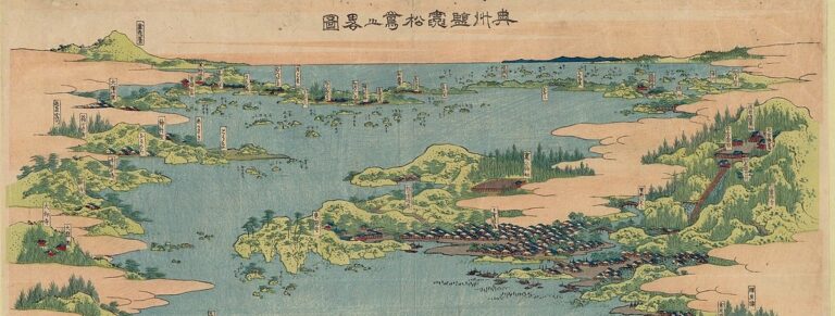 From Shiogama Shrine, I take a ferry to Matsushima, an archipelago of rocky islands covered with twisted pines. Each one a bonsai against the gray horizon. There are hand-drawn maps at the back of nearly every translation of The Narrow Road, showing how far Basho walked in a time when few people traveled for pleasure. Basho and Sora wore monks’ robes for safety on the road, signaling they carried nothing of value but poetry, which they gave away. Then, people who might not have considered themselves poets sat in circles and wrote long sequences of linked haiku, renga; a kind of board game. Basho left haiku on doorposts as thank you notes. At Matsushima he slept with the windows open to the bay, unable to write, unable to sleep.