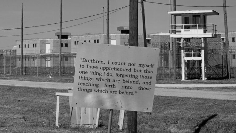 Outside the observation tower for Unit 29 is a sign that reads, “Brethren, I could not myself to have apprehended, but this one thing I do, forgetting those things which are behind and reaching forth unto those things which are before.” The verse reappears across the grounds of Parchman. These are words from the apostle Paul, who is looking forward to the day when he will see the face of Christ rather than looking back at his failures. Paul is forgetting everything that was behind him, including the stoning of Saint Stephen the Martyr, who cried out as he was being stoned, “Lord do not hold this sin against them.” It seems an odd and fatalistic choice to place outside a facility that houses men who are in prison for life. Paul gets to do a victory lap; these men never will. Until they die inside this perpetual conflagration built from concrete and barbed wire, their sins will always be held against them.