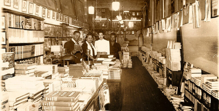 Lewis Micheaux with (from left to right) Margaret Banks (Lewis’s sister), Olive M. Batch (Vaunda’s mother), and Miss Duffy inside the original National Memorial African Bookstore location circa 1945. Courtesy of Vaunda Micheaux Nelson.
