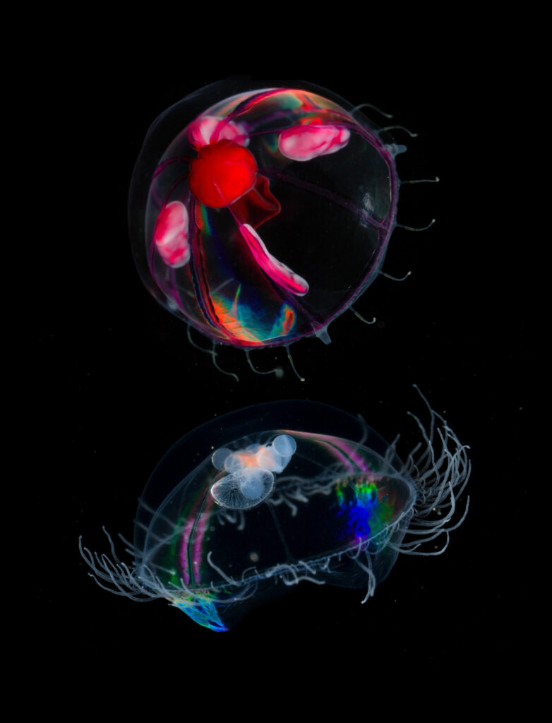 Those we are most familiar with, known as the scyphozoans, are usually the least transparent. This group includes the moon jellies, sea nettles, cannonball jellies, and many others. However, there is a more diverse group of jellyfish, the hydromedusae, that tend to be smaller and far clearer.