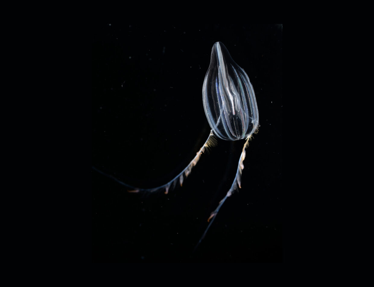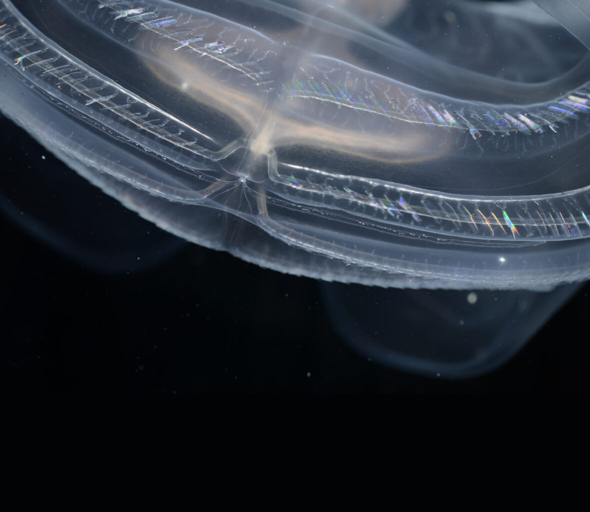 In addition to the jellyfish, we have ctenophores (comb jellies) that superficially look like jellyfish but are less closely related to them than we are. Most of them are astonishingly clear, though a few are milkier or even red at depth (some of the red ones have clarity like a ruby). What unites them all are comb rows, which are made of stacks of little hairs (cilia) that row together to propel the animal through the water.