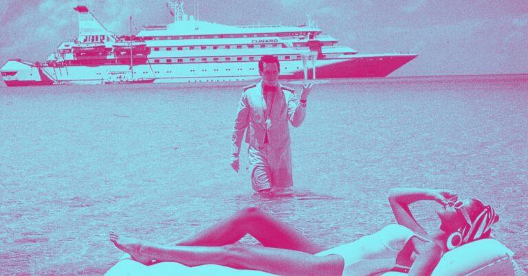with sixteen foot, red and gold ribbon-wrapped topiary