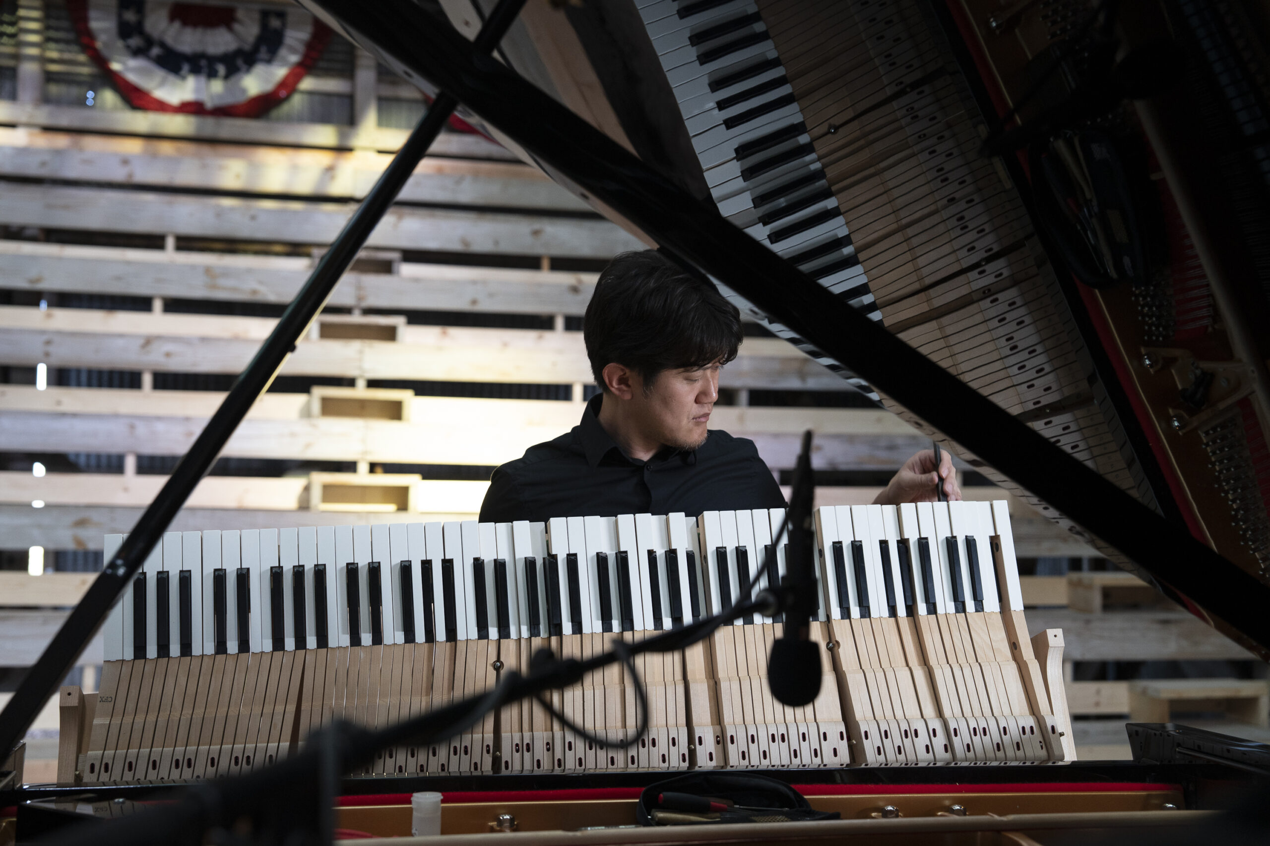 It’s amazing how different it felt for us, almost as if each time we became different artists. Creating the Stardust performance took months of fine embroidery in sound, endlessly refining transitions, searching for a phrase or color that would merge seamlessly with the gentle curve of the slope or the imagined shades of the sky (with help from Yamaha’s Shinya Maeda, pictured below, who tuned our concert grand pianos before each performance, and sometimes during intermission, after a temperature change). The work at the golf course, the “invisible concert,” required another kind of approach: like dreaming of a single, impossible movement, or feeding a bird you’ll one day release with a simple, unrehearsed gesture of the hand.