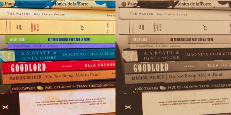 The thick book at the base of this pile (grubby from being carried about at the bottom of my bag), L’Attentat poétique, is a collection of papers given at the first conference dedicated to Hélène Bessette’s work at Cérisy-la-Salle in 2018, published in 2024 by Le Nouvel Attila, who are slowly republishing her complete works. It has been fascinating to translate a writer so committed to brevity, as well as to discontinuity, and even simultaneity.
